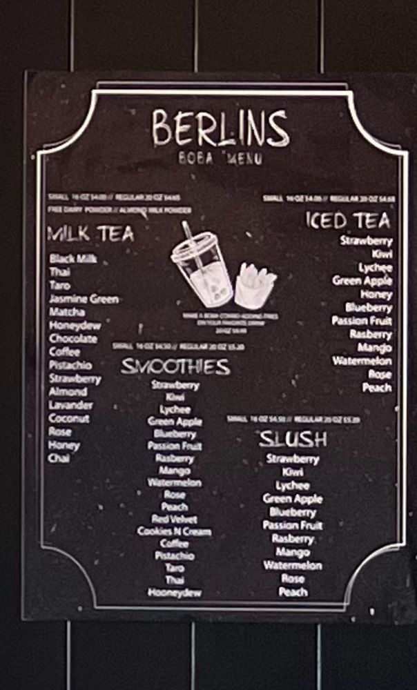 Welcome to Berlins, a German-inspired eatery in Los Angeles that offers a unique combination of Bubble Tea and Sandwiches. This classy yet casual establishment provides a range of amenities, from Wheelchair accessibility to Dog-friendly outdoor seating. The menu boasts delicious options like the Doner Salad, Doner Rice Bowl, flavorful Doner Wraps, and mouthwatering Doner Sandwiches, all topped with homemade Berlins sauce. Customers can enjoy Happy Hour specials and choose from various payment options, including cryptocurrency. The location also offers free Wi-Fi and excellent parking facilities. Berlins is not just a place to eat; it's an experience that caters to a diverse range of preferences, making it perfect for group gatherings, family meals, or a quick lunch stop. Come and savor the flavors of Germany with a modern twist at Berlins.